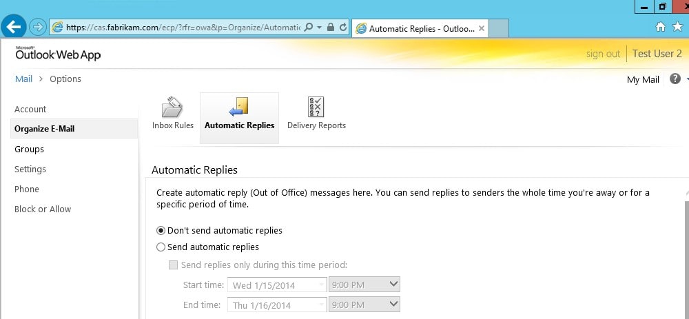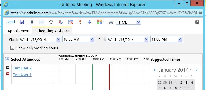 In umgekehrter Richtung funktionierte es nicht. Hier das erwartete Resultat mit der URL des Exchange 2010 (casarray.fabrikam.com) und der Mailbox von Testuser 1 auf Exchange 2013: