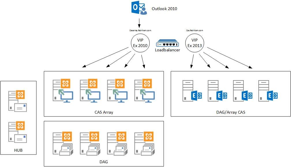 Der Beispielkunde Fabrikam nutzte ursprünglich eine Exchange-2010-SP2-Umgebung mit mehreren Servern pro Rolle: vier Mailbox-Server in einer Database Availability Group, vier Client-Access-Server in einem Array mit Loadbalancer, zwei Hub-Transport- und zwei Edge-Transport-Server.