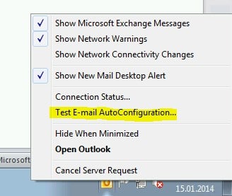 Am einfachsten geht das in Outlook über «Test E-Mail AutoConfiguration…». Halte CTRL gedrückt, um das Kontextmenü zu öffnen: