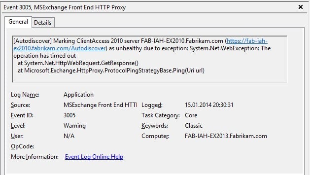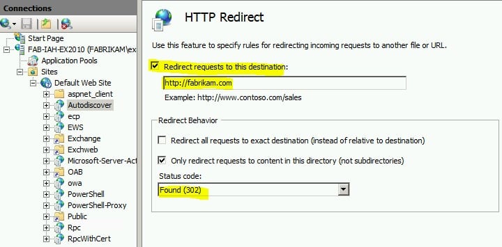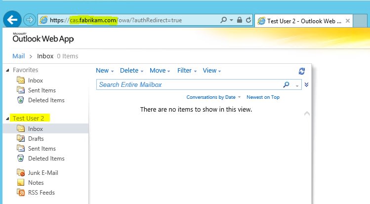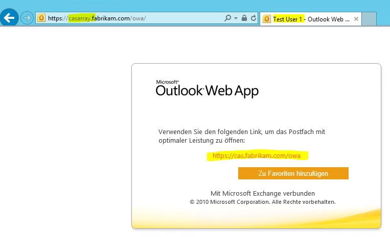 Die Outlook Web App (OWA) funktionierte dagegen problemlos. Die URL zeigte auf Exchange 2013 (cas.fabrikam.com), die Mailbox lag aber noch auf Exchange 2010. Der Zugriff wurde also nicht umgeleitet, sondern weitergeleitet: