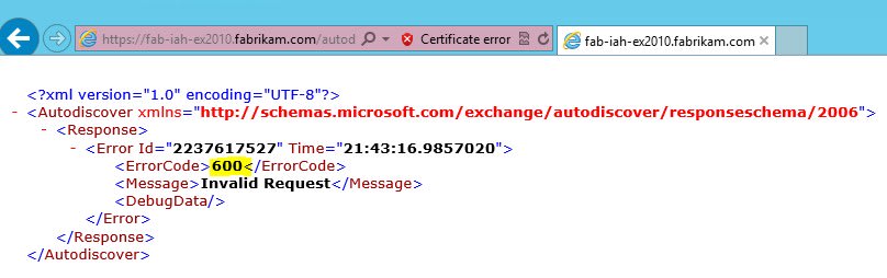 Da der Servername nicht im Zertifikat enthalten war, erschien eine Warnmeldung – kein Problem, da sich die Server gegenseitig vertrauen. Der Errorcode 600 ist ebenfalls normal: Exchange erkennt anhand des Request-Headers, dass der Aufruf nicht von Outlook, sondern vom Internet Explorer kommt – daher «Invalid Request».