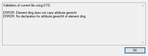 Man wird also gewarnt, dass das Element «ding» kein Attribut «gewicht» hat und dass es keine Deklaration für das Attribut «gewichtt» gibt. Daraus abzuleiten, dass man sich vertippt hat, dürfte dann ein Leichtes sein.