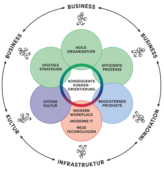 Basierend auf den Kompetenzen, die Mitarbeitende im digitalen Wandel benötigen, hat Digicomp ein Modell mit sieben Handlungsfeldern entwickelt. Im Zentrum steht der Kunde. Darum herum wirken Strategie, agile Organisation, effiziente Prozesse, offene Kultur und inspirierende Innovation zusammen. Dieses System funktioniert nur mit einer stabilen, modernen technischen Infrastruktur.