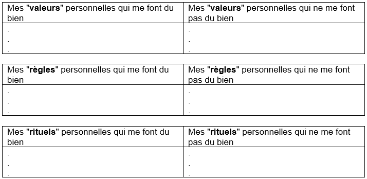 Par exemple, vos valeurs (ce qui est particulièrement important pour vous, ce que vous incarnez…), vos règles (ce qu’il faut faire et ne pas faire), votre attitude envers vous-même, envers votre conjoint, l’éducation de vos enfants, vos rapports avec vos collègues, employés, supérieurs… et aussi vos rituels : Qu’est-ce qui est devenu partie intégrante de vous-même, que faites-vous automatiquement… ?