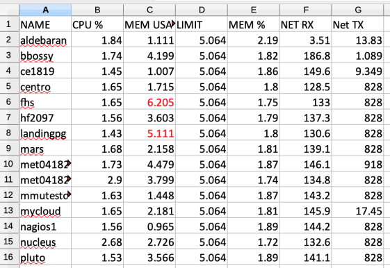 Je nach docker-Version kann der Output variieren. Praktisch wäre nun eine Excel-Tabelle mit diesen Werten, um z.B. den gesamten Verbrauch an Memory zu berechnen.