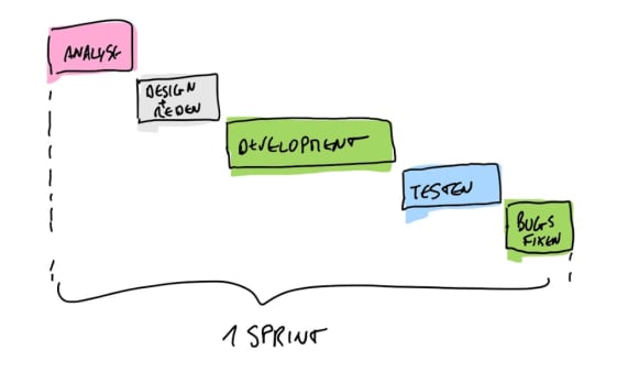 Was ich oft beobachten kann, ist, dass die Teams im Mini-Wasserfall-Modus arbeiten. Das heisst, in einem Scrum Sprint arbeiten sie in vier oder fünf Phasen.