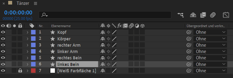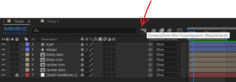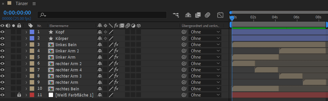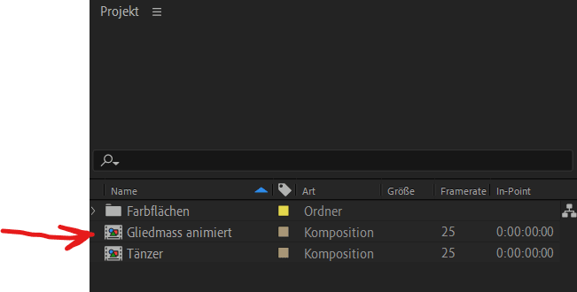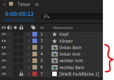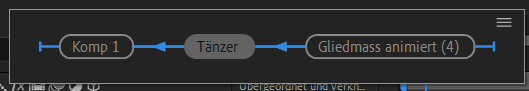 In der Komposition «Tänzer» befindet sich 4 mal die Komposition «Gliedmass animiert». Die Komposition «Tänzer» wiederum befindet sich in der Komposition «Komp 1», welche ich nutze, um die Animationen zu exportieren.