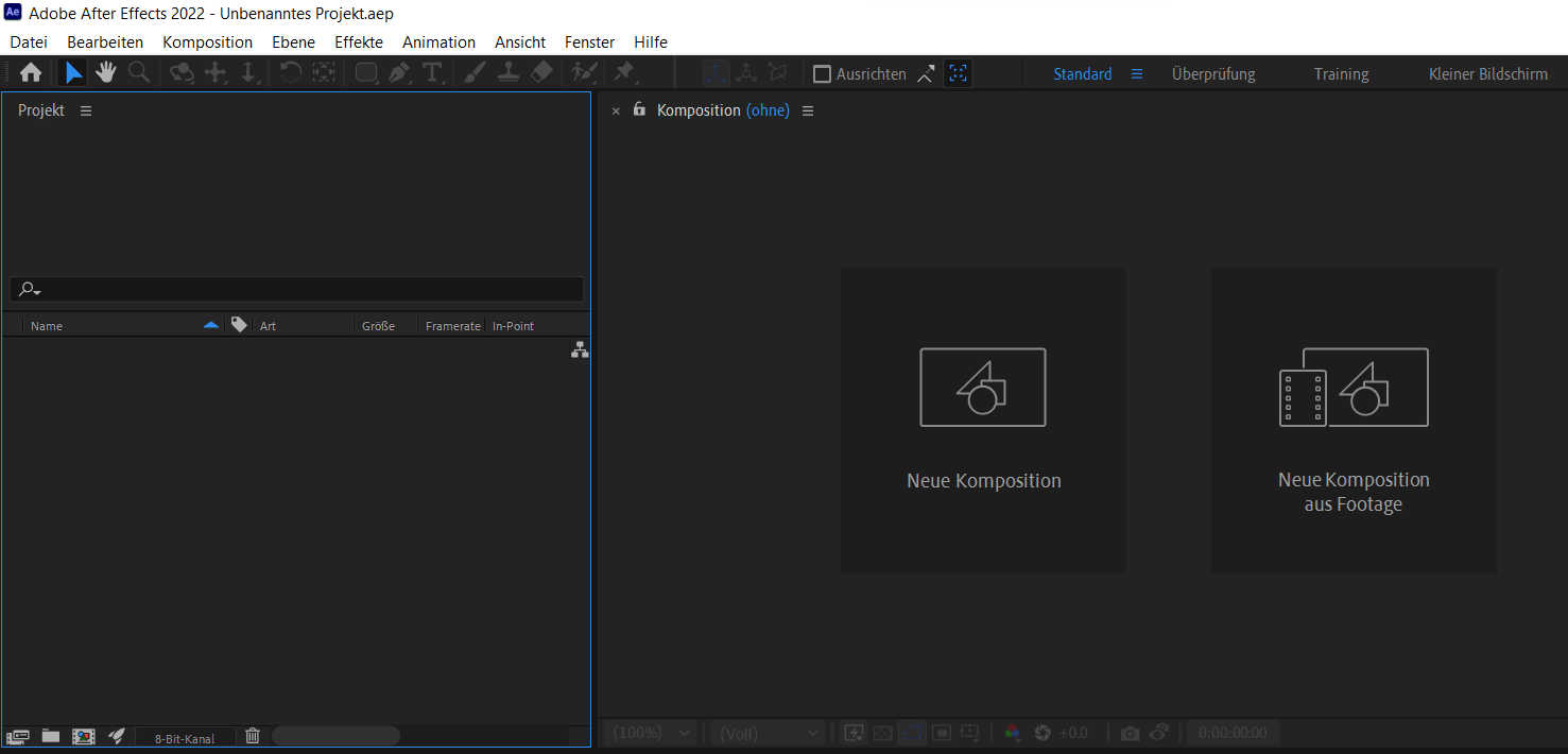 In After Effects muss ich NICHT explizit ein Projekt anlegen. Das erste, was man meistens macht ist, eine Komposition anzulegen: