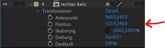 Bei den einzelnen Ebenen / Unterkompositionen passe ich jetzt lediglich die Position etwas an, damit sich nicht alle Gliedmassen an derselben stelle befinden.