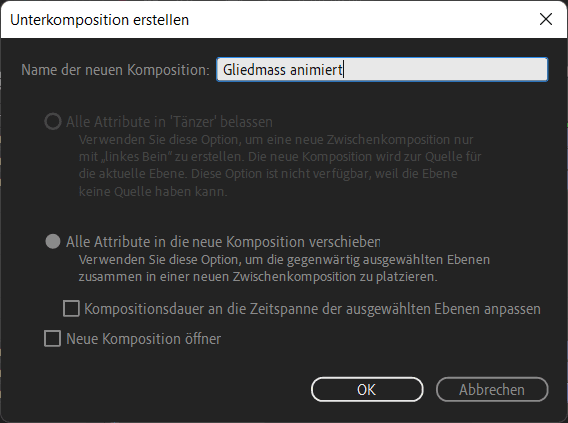 Schritt 2: Wir geben der Unterkompositionen einen Namen und wählen «Alle Attribute in die neue Komposition verschieben». Fertig.