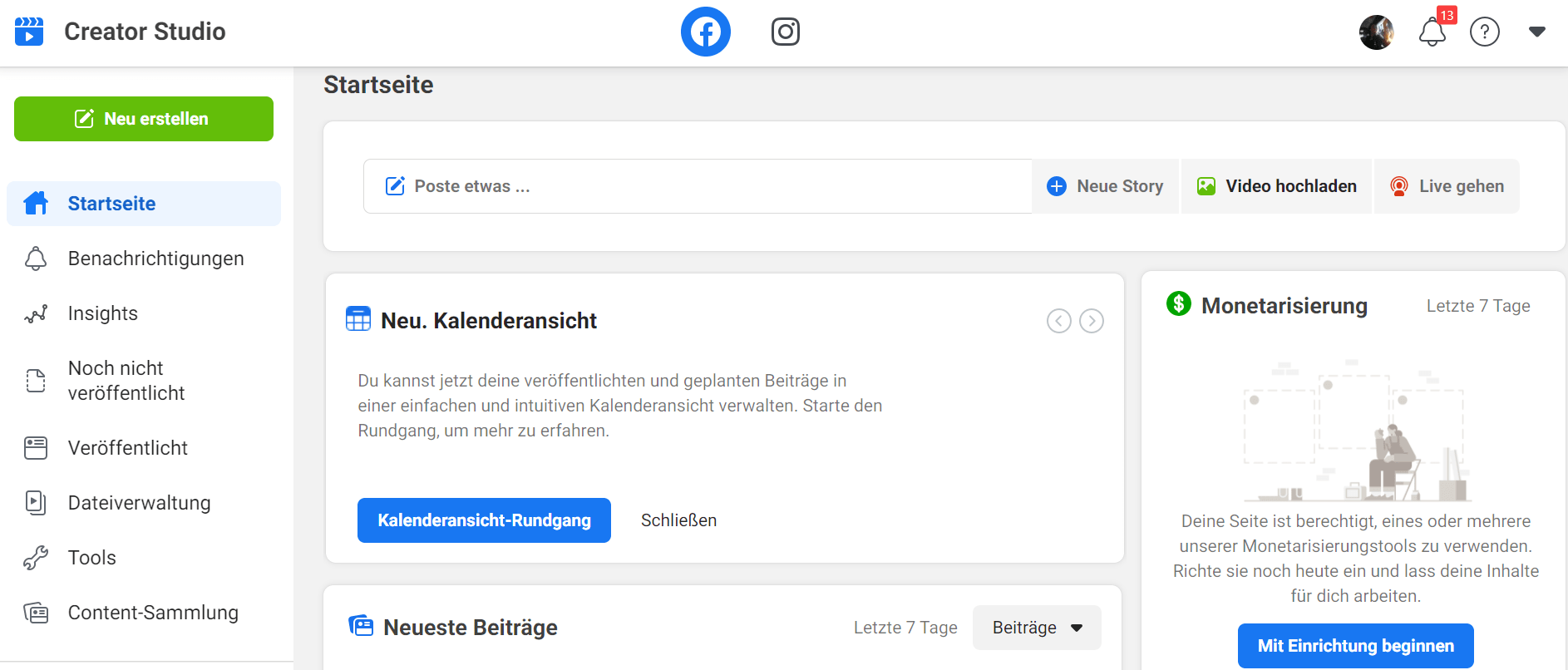 Creator Studio hilft dir bei der Planung, Messung und Monetarisierung deiner Facebook- und Instagram-Posts. Die Beiträge können im Detail verwaltet, dank den Insights ausgewertet und allfällige Optimierungen vorgenommen werden. Das Tool ist im ständigen Wandel und bietet somit regelmässig neue Funktionen an. Dank diesem Tool wird deine tägliche Arbeit um einiges erleichtert.