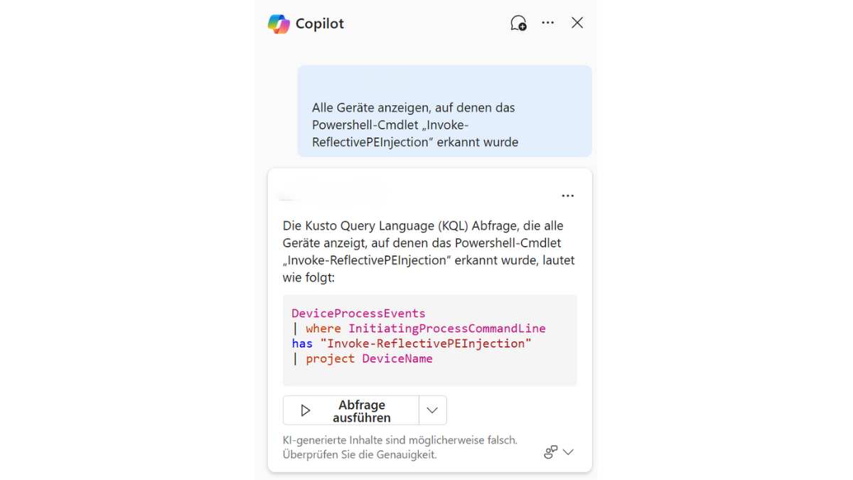 Trotz des Wertes dieser Informationen wird der Threat Hunter die Überprüfung manuell vornehmen wollen. Wir wechseln im Microsoft Defender XDR-Portal zu Advanced Hunting. Von hier aus werden wir Copilot for Security bitten, eine KQL-Abfrage zu erstellen, um alle Geräte zu finden, auf denen ein bestimmtes PowerSploit-Cmdlet erkannt wurde.