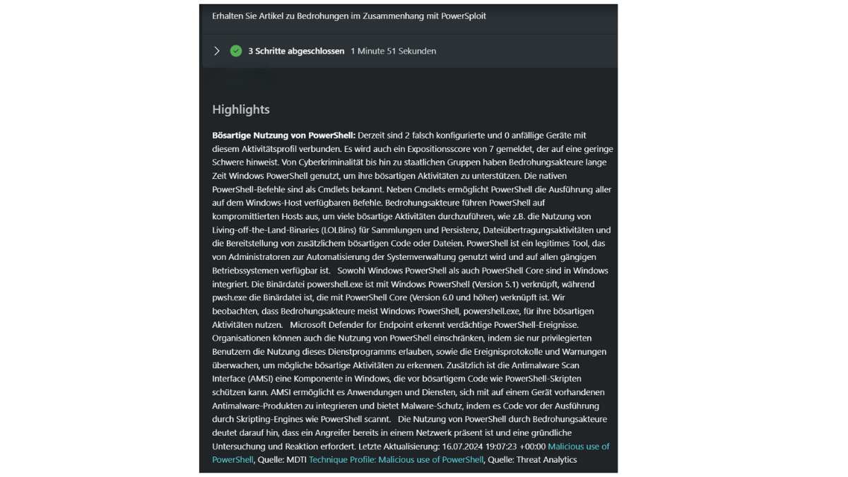 Wir beginnen mit der Eingabe des Prompts «Get threat articles related to PowerSploit» (Artikel über Bedrohungen im Zusammenhang mit PowerSploit abrufen), um Artikel und Highlights abzurufen und das potentielle Vorhandensein auf unseren Geräten zu identifizieren.