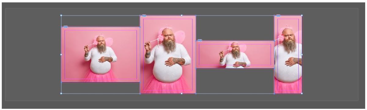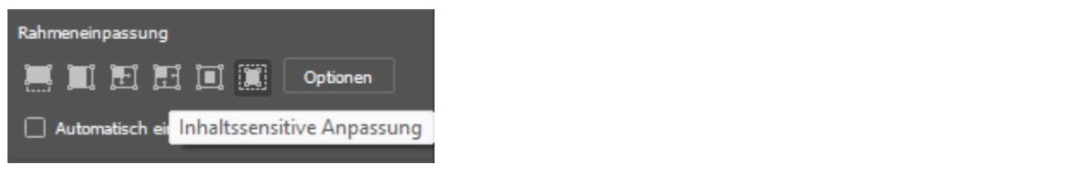 Es muss nicht jedes Bild einzeln ausgerichtet werden, stattdessen alle Rahmen markieren und in der Palette «Eigenschaften» als «Rahmenanpassung» das AI-gestützte «Inhaltssensitive Anpassung» auswählen: