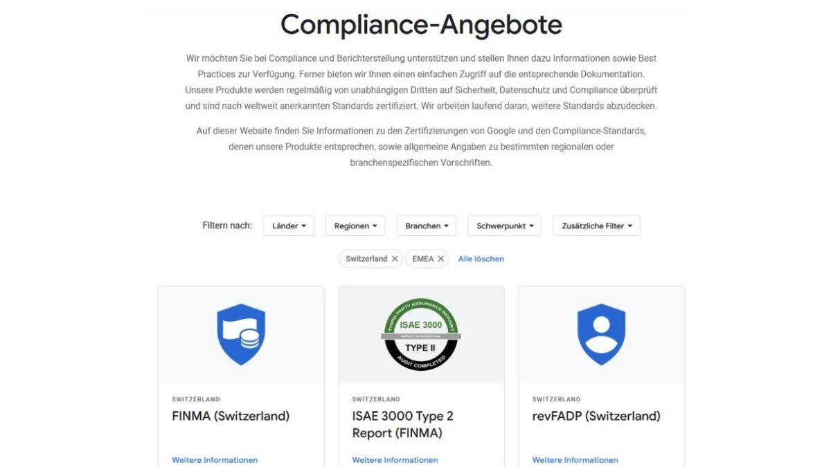 Im Compliance Resource Center kannst du nach Ländern, Regionen, Branchen und bestimmten Schwerpunkten – zum Beispiel Security – filtern. Du erhältst dann eine Übersicht über alle für dich relevanten Richtlinien und Gesetze und kannst per Klick hierzu detaillierte Infos einsehen. Auch wie Google diese einhält und welche spezifischen Produkte es gegebenenfalls zur Unterstützung gibt, erfährst du hier. So erfüllt Google Cloud zum Beispiel die für die Schweiz relevanten Richtlinien FINMA, ISAE 3000 Type 2 Report und revFADP.