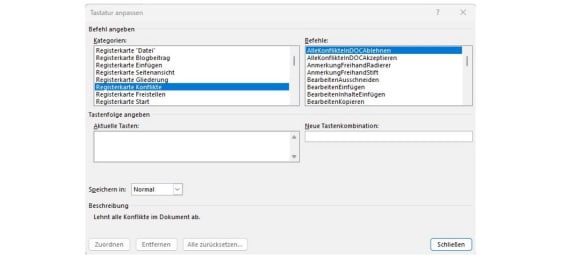 Im Feld «Befehle» den Befehl auswählen, dem eine neue Tastenkombination zugewiesen werden soll.