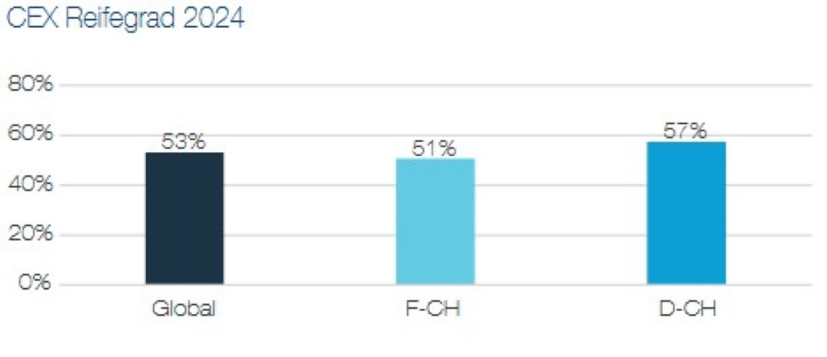 In fast jedem Unternehmensleitbild ist die Kundenorientierung also ein fest verankerter Grundsatz. In der Praxis wird sie aber noch nicht vollständig gelebt: Beim Reifegrad bezüglich der Customer Experience erzielten die Schweizer Unternehmen nur gut die Hälfte der möglichen Punkte.
