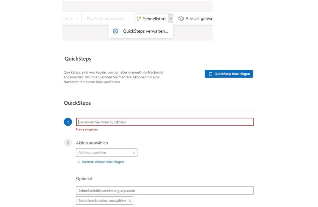 Mehrere Arbeitsschritte mit nur einem Klick erledigen? Das gelingt mit «Outlook QuickSteps»! So kann beispielsweise in einem Schritt eine E-Mail weitergeleitet, verschoben, kategorisiert, mit einer Textvorlage beantwortet und eine sich aus ihr ableitende Aufgabe erstellt werden.