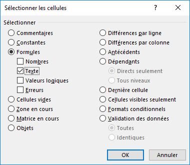 L’option “Formules”, case à cocher “Texte” permet par ex. de sélectionner des cellules avec des formules texte ou des fonctions texte.