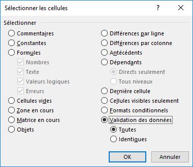 Si des validations ont été définies, et peuvent donc être saisies dans une cellule, vous trouverez les cellules correspondantes dans la feuille de calcul en passant par l’option “Validation des données”.