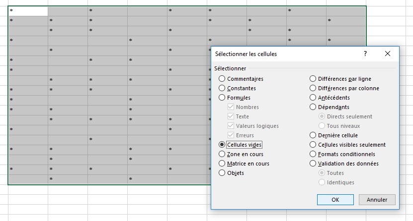 Sélectionnez par ex. un champ, puis l’option “Cellules vides” vous permet d’afficher automatiquement toutes les cellules vides du champ.