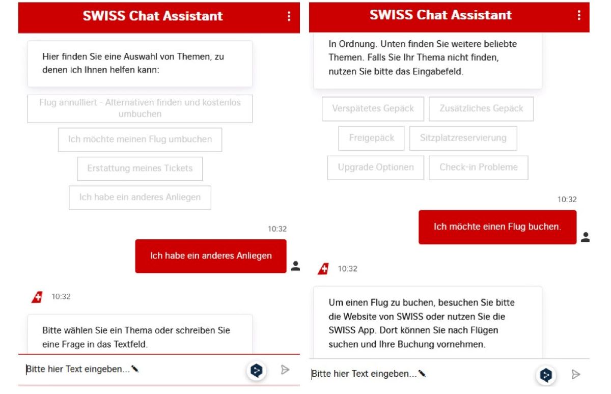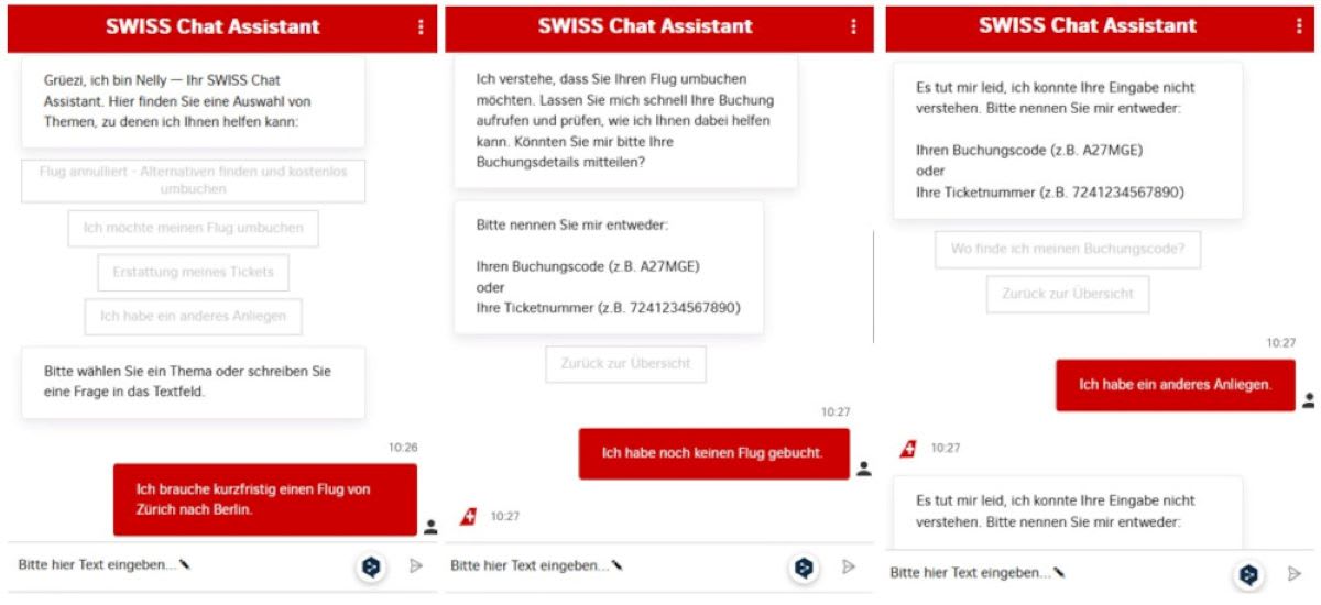 Die nationale Fluggesellschaft SWISS bietet einen Chatbot namens «Nelly». Der ist in seiner Funktionsweise aber offenbar stark eingeschränkt. Ihn zu Hilfe zu nehmen, um sich Flüge anzeigen zu lassen, funktioniert zumindest nicht auf Anhieb. Eine erste Anfrage scheint «Nelly» zu überfordern.