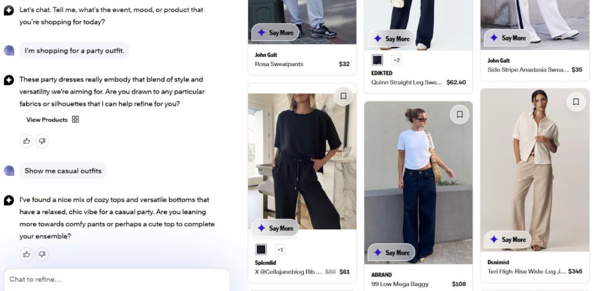 Der KI-Shopping-Chatbot des Startups Daydream erweist sich als persönlicher Shopping- und Style-Experte. Bevor es losgehen kann, müssen Nutzende einige Infos über sich preisgeben: Name, Geschlecht, Alter, Lieblings-Modemarken, Kleider- und Schuhgröße, Budget. Dann schlägt der Chatbot im Nu diverse Outfits für einen angefragten Anlass vor und stellt hilfsbereite Folgefragen. Mit Klick auf die vorgeschlagenen Kleidungsstücke oder Accessoires erhalte ich detaillierte Infos und kann mich zum Shop des Anbieters weiterklicken.
