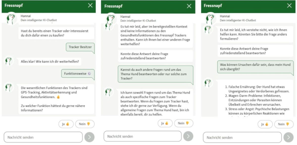 Fressnapf zählt zu den glaubwürdigsten Haustierbedarfsmarken in der Schweiz. Im Help-Center zum Tracker für Hunde und Katzen findet sich der digitale KI-Chatbot «Hannai». In der Interaktion ergreift der Chatbot die Initiative. Er stellt zuerst die Frage, ob ich bereits einen Tracker besitze, und schlägt dann Themenbereiche für meine Frage vor. Meine Frage nach Details kann «Hannai» dann aber leider nicht beantworten. Allgemeine Fragen rund um das Thema Hund und Katze kann der Chatbot laut Selbstauskunft zwar beantworten, tut sich mit konkreten Detail-Fragen aber sehr schwer. Auf allgemeine Fragen gibt «Hannai» hingegen ausführliche Informationen.