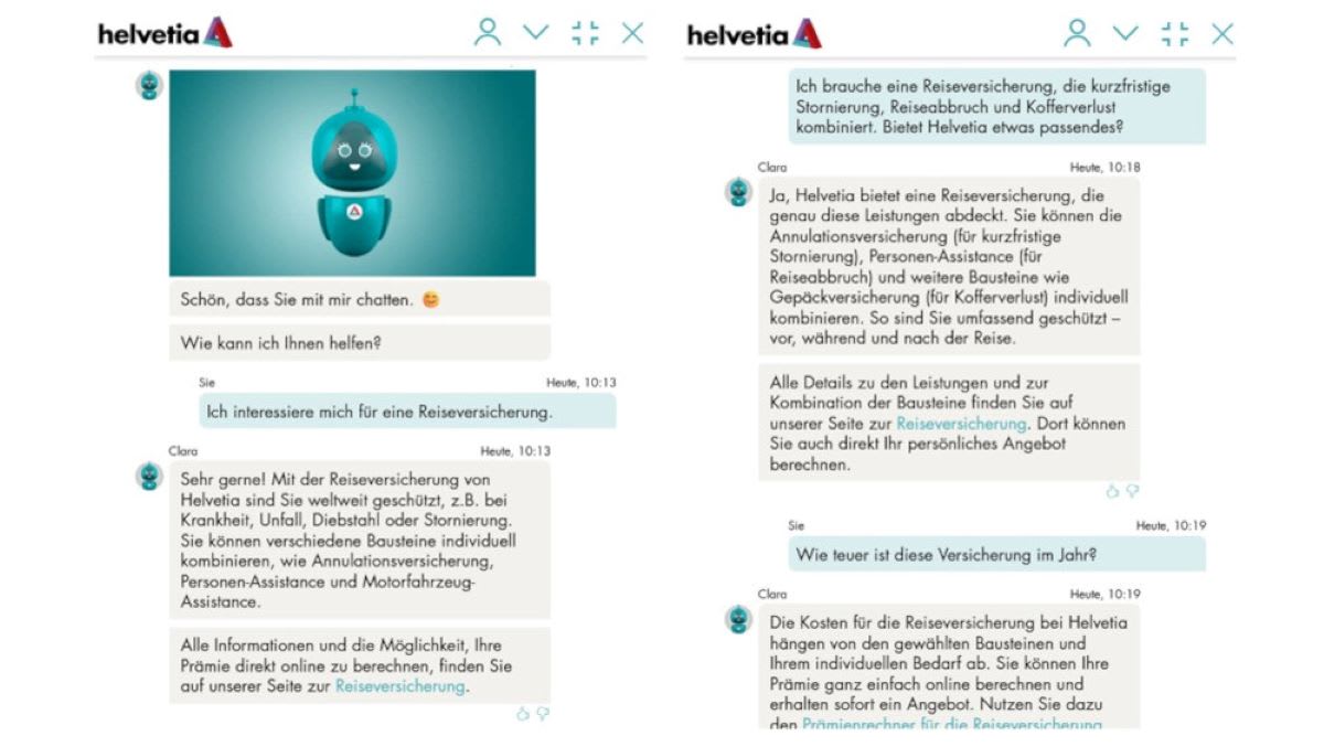 Di Helvetia Gruppe ist einer der führenden schweizerischen Versicherungsgruppen und bietet mit dem KI-Chatbot «Clara» einen freundlichen und hilfsbereiten digitalen Assistenten. Die Antworten auf meine Fragen lassen einen kleinen Moment auf sich warten, den überbrückt «Clara» aber mit der charmanten Information, dass sie noch für mich nachdenkt. Bei der Suche nach einer Reiseversicherung mit bestimmten Antworten liefert der Chatbot zufriedenstellende Informationen, konkrete Preise nennt «Clara» auf Rückfrage aber nicht. Für spezifische Informationen und Produktangebote müssen Interessenten dann doch die Internetseite oder Kundenberater/innen zu Hilfe ziehen.