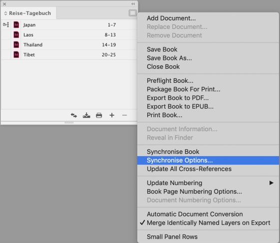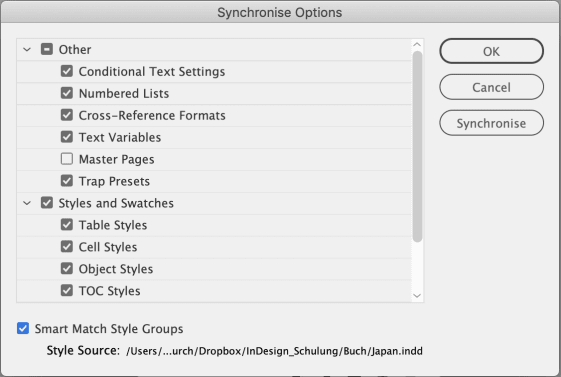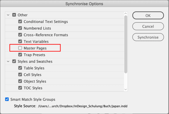 Denn: Im Synchronisierung-Menü legst du fest, wer der Chef ist und wie sich Musterseiten und Formate, Farben und vieles mehr verhalten sollen.