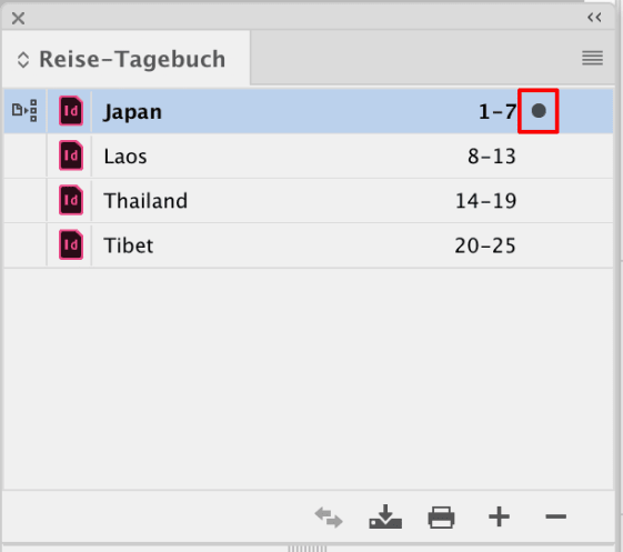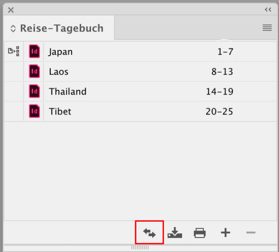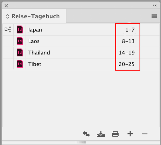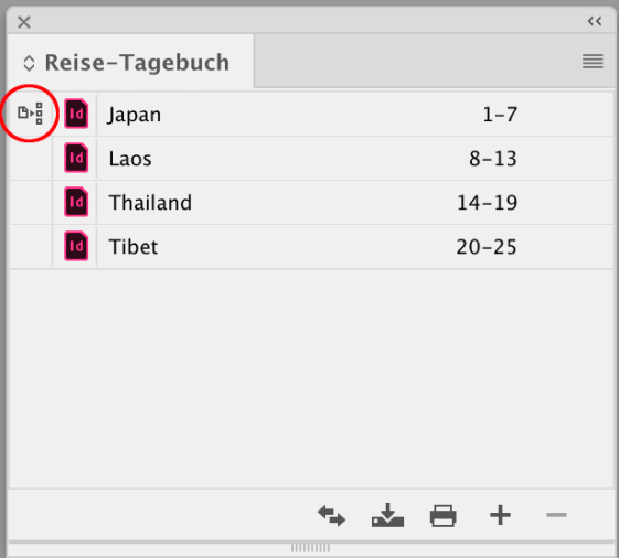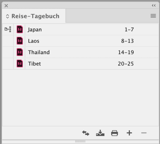 Man muss sich das so vorstellen: jeder Abschnitt, sei es ein Kapitel in einem Roman oder ein Produktabschnitt in einem Katalog, ist ein eigenes InDesign-Dokument. Diese werden in einem Buch-Dokument zusammengefasst.